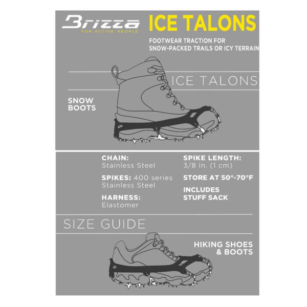 DESCRIPTION: Technical, resistant and elastic crampons made in TPE elastomer suitable for low temperatures. Excellent traction on ice and snow. Stainless steel tips. Easy to wear over all types of shoes. Total sole coverage
